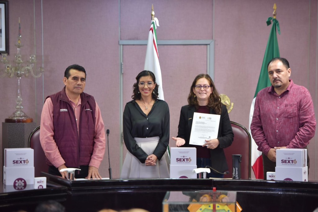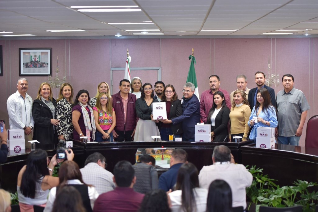 Xalapa, Ver., 15 de noviembre de 2024.- La LXVII Legislatura, por conducto de la presidenta y del secretario de la Mesa Directiva, diputada Tanya Carola Viveros Cházaro y Felipe Pineda Barradas, respectivamente, así como por el presidente de la Junta de Coordinación Política (Jucopo), diputado Esteban Bautista Hernández, recibió de la titular de la Oficina de Programa de Gobierno, Waltraud Martínez Olvera, el VI Informe de Gobierno de la administración del ingeniero Cuitláhuac García Jiménez.