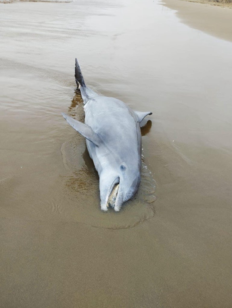 Coatzacoalcos, Ver. – La mañana de este sábado, un delfín muerto fue arrastrado hasta la playa de Coatzacoalcos, a la altura de la avenida Abraham Zabludovsky, en la zona poniente de la ciudad. El hallazgo ocurrió luego del fuerte oleaje provocado por el paso del frente frío número 25.
