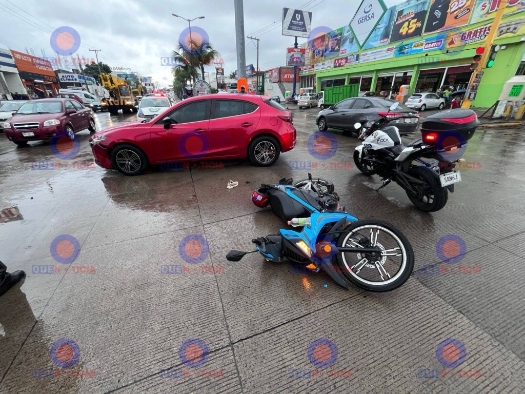 Boca del Río, Ver. Una mujer resultó con probable fractura en una pierna luego de que se vio involucrada en un accidente cuando viajaba en su motoneta; presuntamente se pasó la luz roja del semáforo y colisionó contra un vehículo particular.