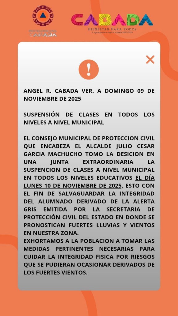 Por instrucciones del Consejo Municipal de Protección Civil, fueron suspendidas las clases este lunes 10 de noviembre en todo el municipio de Ángel R. Cabada, ante la entrada del Frente Frío No. 13 que provocará lluvias intensas y fuertes rachas de viento en la región.