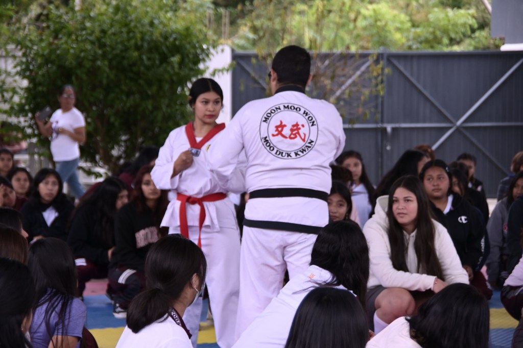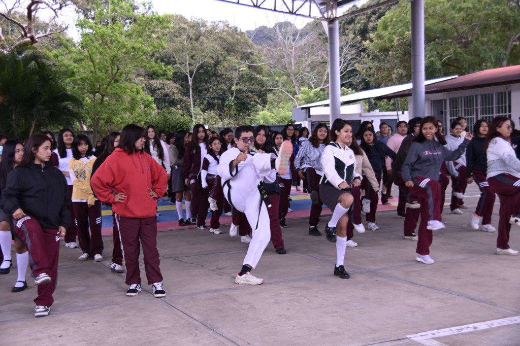 La actividad se llevó a cabo en las instalaciones del COBAEV Plantel 70, en la que jóvenes participaron en una jornada practica de aprendizaje sobre técnicas básicas de defensa personal.